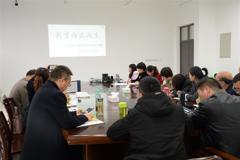 冬日的严寒抵抗不住学习的脚步, 1129日下午,陕西省初中学校管理人员跟岗见习十六位领导老师和翠中的班主任们齐聚在“智仁名班主任工作室”,聆听来自工作室领衔人、常州市高级班主任周泓涤老师关于《教育正向而生》的班级文化建设主题报告。周老师从“两会”(家长会、班会)入手谈如何让教育向正而生。